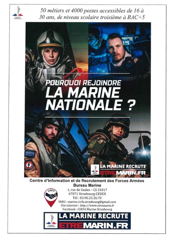 Les Marins conseillers du Centre d’Information et de Recrutement des Forces Armées de Strasbourg ont pour vocation d’informer, conseiller et orienter nos jeunes concitoyens vers des métiers valorisants permettant d’assurer en permanence la sécurité et la protection de l’espace maritime français.